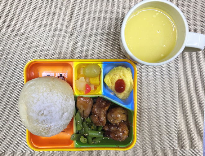 パン・鶏の照り焼き・いんげん胡麻和え・オムレツ・デザート・スープ