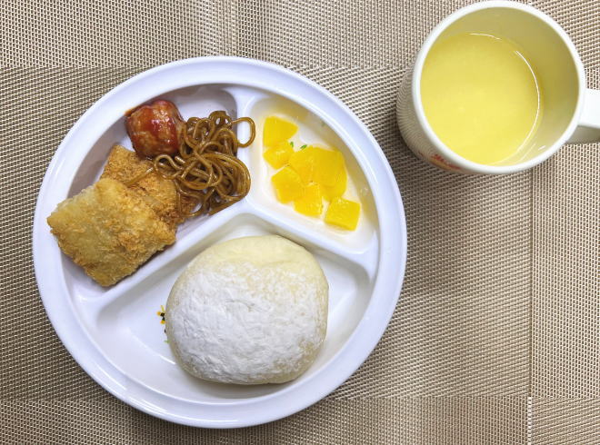 パン・白身フライ・ミートボール・焼きそば・デザート・スープ