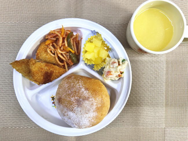 パン・エビカツ・ナポリタンスパゲティー・ポテトサラダ・デザート・スープ