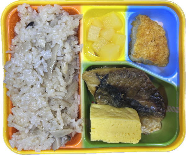 とり飯・魚の塩焼き・コロッケ・たまご焼き・デザート