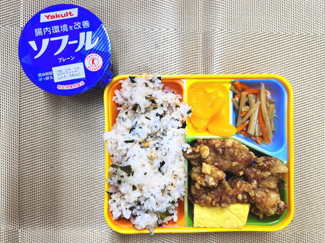 鮭ご飯・鶏のから揚げ・たまご焼き・きんぴら・デザート