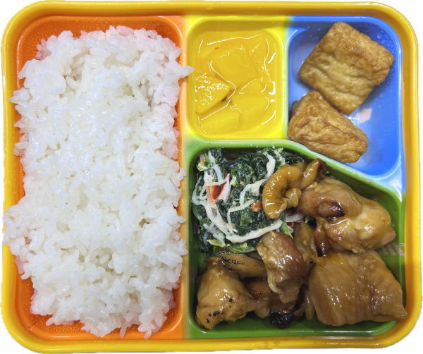ご飯・鶏の照り焼き・かにかま和え・厚揚げ煮・デザート
