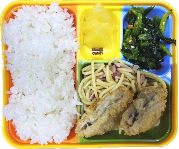 ご飯・白身フライ・ベーコンスパゲティー・ほうれん草の和え物・フルーツ