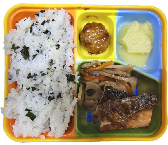 わかめご飯・魚の塩焼き・レンコン煮・ミートボール・フルーツ