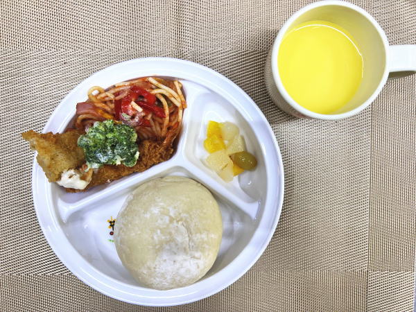 パン・エビフライ・ナポリタンスパゲティー・ブロッコリーサラダ・フルーツ・スープ