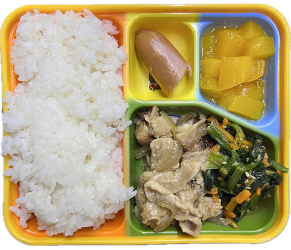 ご飯・豚肉の焼肉タレ炒め・ホウレン草ナムル・あらびきウインナー・フルーツ