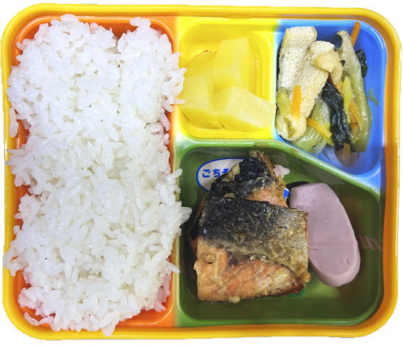 ご飯・鮭みそ焼き・チンゲン菜の煮物・ソーセージ・フルーツ
