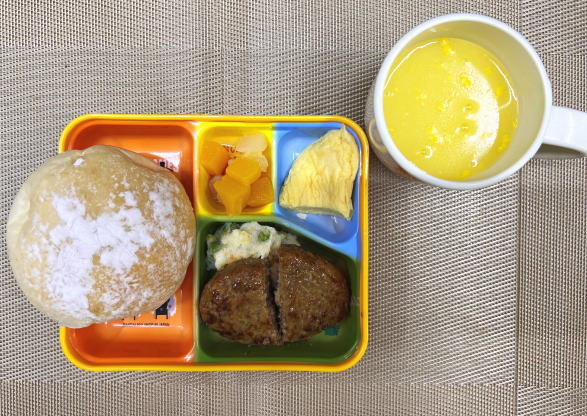 パン・照り焼きハンバーグ・オムレツ・ポテトサラダ・デザート・スープ