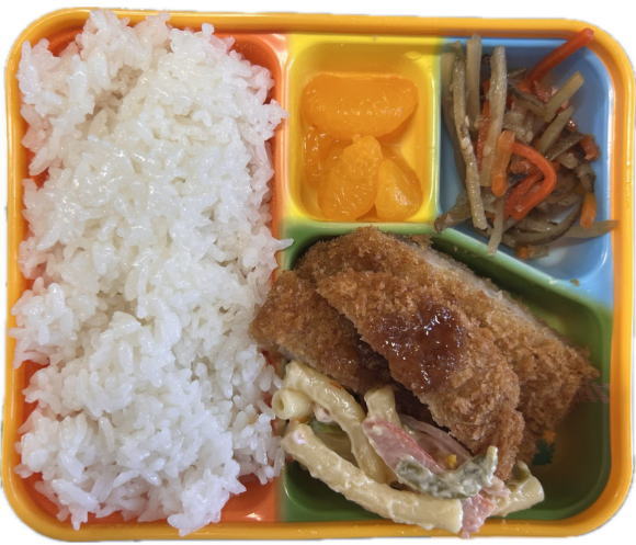 ご飯・とんかつ・きんぴら・マカロニサラダ・デザート