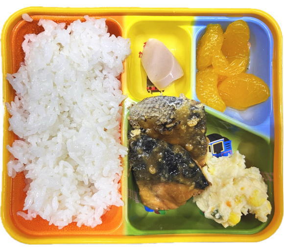 ご飯・魚みそ焼き・魚肉ソーセージ・ポテトサラダ・デザート