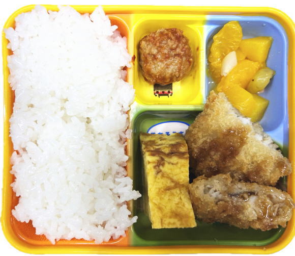 ご飯・白身フライ・卵焼き・ケチャップ団子・デザート