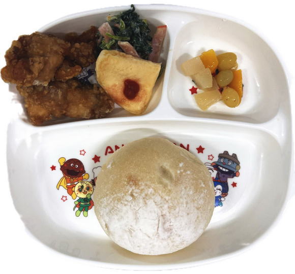パン・鶏のから揚げ・ほうれん草サラダ・オムレツ・デザート