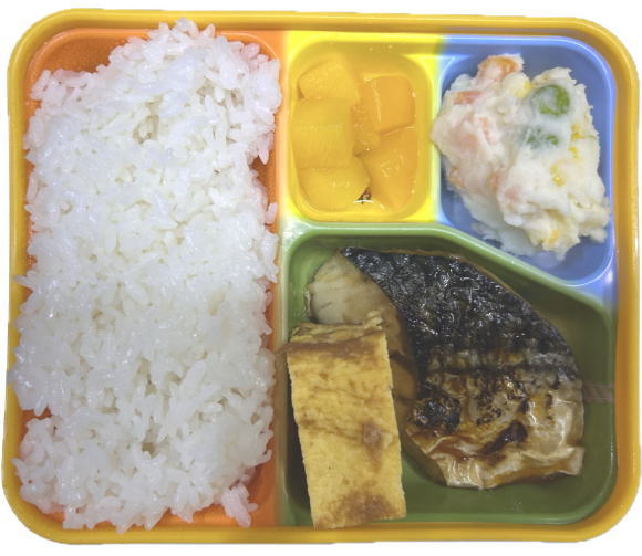 ご飯・魚の蒲焼き・卵焼き・ポテトサラダ・デザート