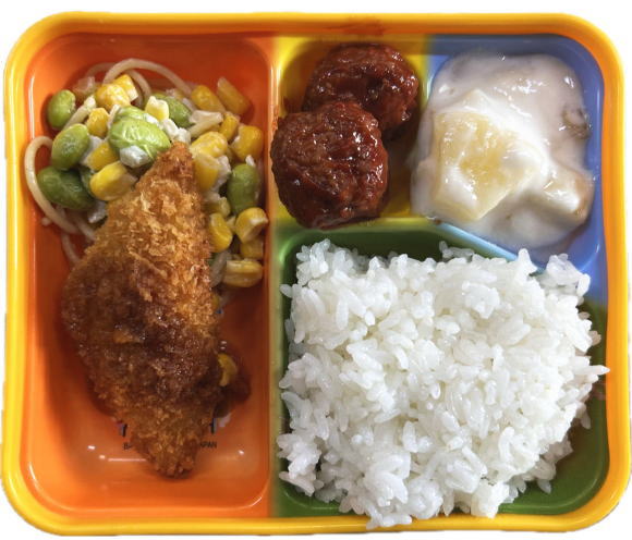 ご飯・白身フライ・ミートボール・サラダスパゲティ・フルーツヨーグルト