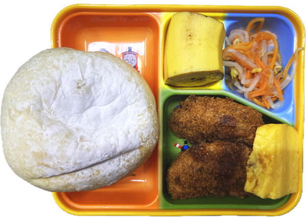 パン・ハムカツ(ソース)・卵焼き・もやしと人参のナムル・バナナ