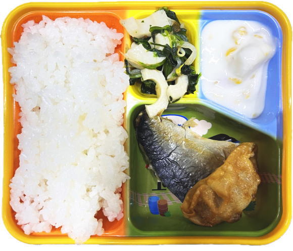 ご飯・塩サバ・揚げぎょうざ・ちくわと野菜のサラダ・フルーツヨーグルト