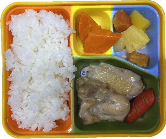 ご飯・ローストチキン・ウインナー・人参のグラッセ・フルーツ