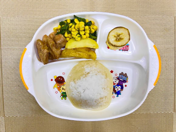 パン・照り焼きチキン・ほうれん草とコーンのバターソテー・フライドポテト・バナナ