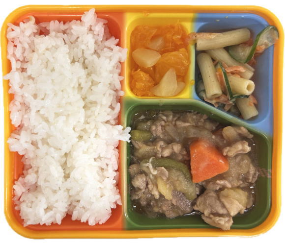 ご飯・うさぎハンバーグ・人参天ぷら・マカロニサラダ・フルーツ