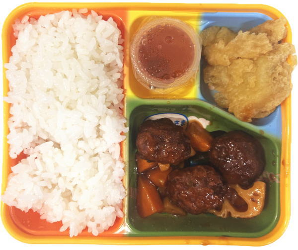 ご飯・肉団子と野菜の甘酢あんかけ・サツマイモの天ぷら・ゼリー