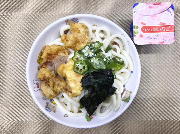 特製うどん(とり天・オクラ・わかめ)・ヨーグルト