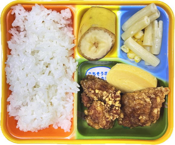 ご飯・から揚げ・卵焼き・マカロニサラダ・バナナ