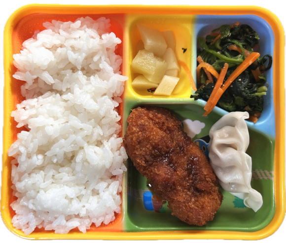 ご飯・トンカツ・ぎょうざ・おひたし・フルーツ