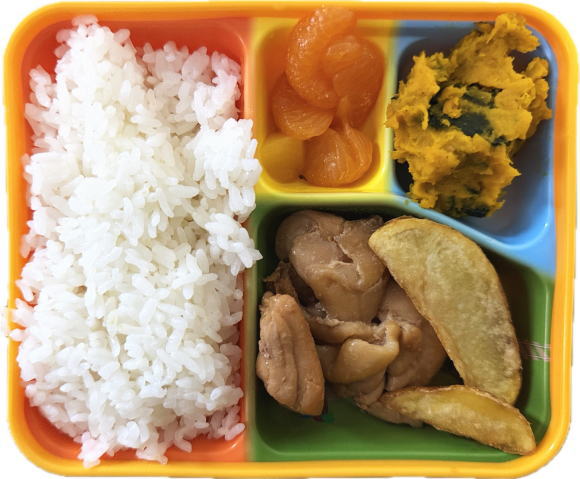ご飯・照り焼きチキン・フライドポテト・かぼちゃサラダ・フルーツ
