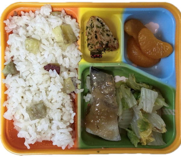 芋ご飯・魚の味噌煮・白菜のおかか和え・フルーツ