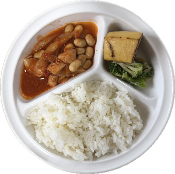 ご飯・鶏肉と大豆のトマト煮・ブロッコリーとツナのサラダ・フルーツ